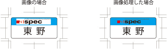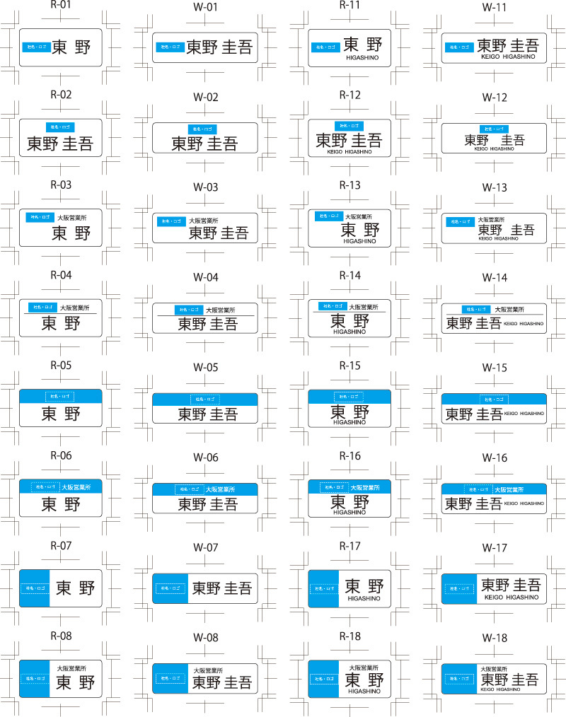 尚、名札テンプレートR-05~08・W-05~08等のベタ有りデザインに抜き文字が入る場合は画像の処理が必要となりますので、別途制作費をお見積もりさせていただきます。
